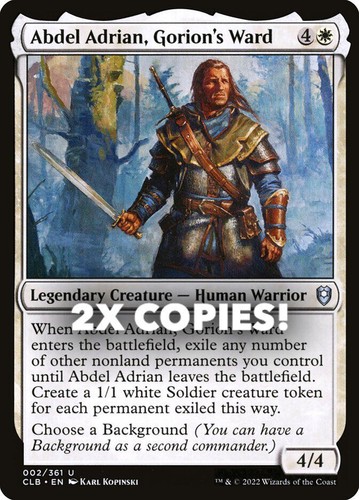 Magic the Gathering card, two copies of Abdel Adrian, Gorion’s Ward Nonfoil in Near Mint condition. Uncommon from commander legends: battle for baldur’s gate (CLB-2). A great addition to any collection or deck! Securely shipped in protective packaging. STOCK PHOTO USED.