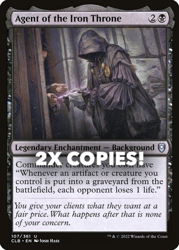 Magic the Gathering card, two copies of Agent of the Iron Throne Nonfoil in Near Mint condition. Uncommon from commander legends: battle for baldur’s gate (CLB-107). A great addition to any collection or deck! Securely shipped in protective packaging. STOCK PHOTO USED.