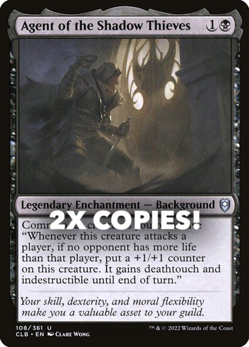 Magic the Gathering card, two copies of Agent of the Shadow Thieves Nonfoil in Near Mint condition. Uncommon from commander legends: battle for baldur’s gate (CLB-108). A great addition to any collection or deck! Securely shipped in protective packaging. STOCK PHOTO USED.