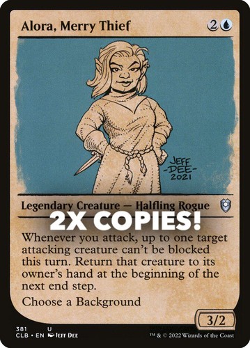 Magic the Gathering card, two copies of Alora, Merry Thief Nonfoil Showcase in Near Mint condition. Uncommon from commander legends: battle for baldur’s gate (CLB-381). A great addition to any collection or deck! Securely shipped in protective packaging. STOCK PHOTO USED.