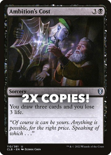 Magic the Gathering card, two copies of Ambition’s Cost Nonfoil in Near Mint condition. Uncommon from commander legends: battle for baldur’s gate (CLB-110). A great addition to any collection or deck! Securely shipped in protective packaging. STOCK PHOTO USED.