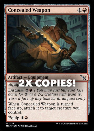 Magic the Gathering card, two copies of Concealed Weapon Nonfoil in Near Mint condition. Uncommon from murders at karlov manor (MKM-117). A great addition to any collection or deck! Securely shipped in protective packaging. STOCK PHOTO USED.