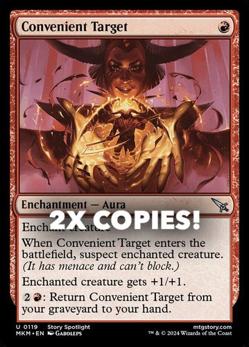 Magic the Gathering card, two copies of Convenient Target Nonfoil in Near Mint condition. Uncommon from murders at karlov manor (MKM-119). A great addition to any collection or deck! Securely shipped in protective packaging. STOCK PHOTO USED.