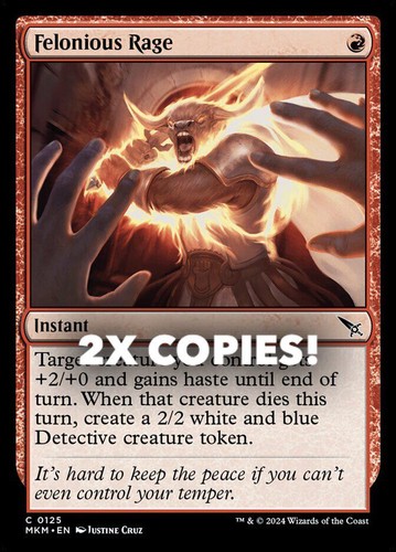 Magic the Gathering card, two copies of Felonious Rage Nonfoil in Near Mint condition. Common from murders at karlov manor (MKM-125). A great addition to any collection or deck! Securely shipped in protective packaging. STOCK PHOTO USED.