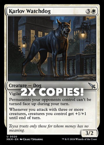 Magic the Gathering card, two copies of Karlov Watchdog Nonfoil in Near Mint condition. Uncommon from murders at karlov manor (MKM-20). A great addition to any collection or deck! Securely shipped in protective packaging. STOCK PHOTO USED.