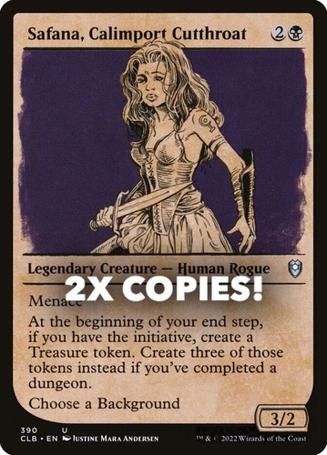 Magic the Gathering card, two copies of Safana, Calimport Cutthroat Nonfoil Showcase in Near Mint condition. Uncommon from commander legends: battle for baldur’s gate (CLB-390). A great addition to any collection or deck! Securely shipped in protective packaging. STOCK PHOTO USED.
