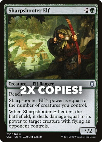 Magic the Gathering card, two copies of Sharpshooter Elf Nonfoil in Near Mint condition. Uncommon from commander legends: battle for baldur’s gate (CLB-253). A great addition to any collection or deck! Securely shipped in protective packaging. STOCK PHOTO USED.