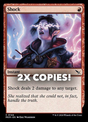 Magic the Gathering card, two copies of Shock Nonfoil in Near Mint condition. Common from murders at karlov manor (MKM-144). A great addition to any collection or deck! Securely shipped in protective packaging. STOCK PHOTO USED.