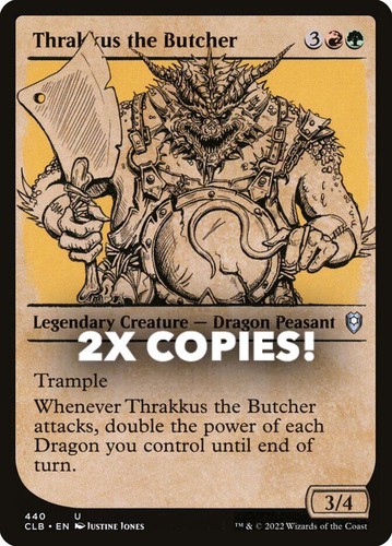 Magic the Gathering card, two copies of Thrakkus the Butcher Nonfoil Showcase in Near Mint condition. Uncommon from commander legends: battle for baldur’s gate (CLB-440). A great addition to any collection or deck! Securely shipped in protective packaging. STOCK PHOTO USED.