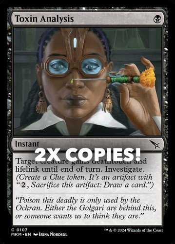 Magic the Gathering card, two copies of Toxin Analysis Nonfoil in Near Mint condition. Common from murders at karlov manor (MKM-107). A great addition to any collection or deck! Securely shipped in protective packaging. STOCK PHOTO USED.