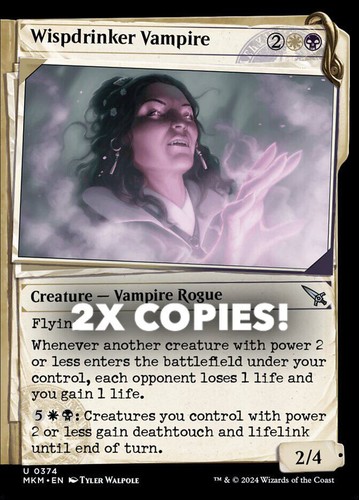 Magic the Gathering card, two copies of Wispdrinker Vampire Nonfoil Showcase in Near Mint condition. Uncommon from murders at karlov manor (MKM-374). A great addition to any collection or deck! Securely shipped in protective packaging. STOCK PHOTO USED.