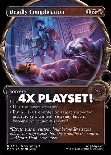 Magic the Gathering card, four copies of Deadly Complication Nonfoil Showcase in Near Mint condition. Uncommon from murders at karlov manor (MKM-312). A great addition to any collection or deck! Securely shipped in protective packaging. STOCK PHOTO USED.