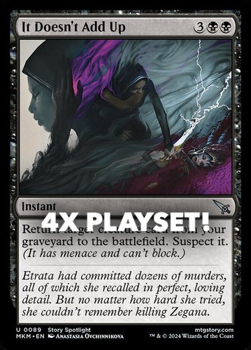 Magic the Gathering card, four copies of It Doesn’t Add Up Nonfoil in Near Mint condition. Uncommon from murders at karlov manor (MKM-89). A great addition to any collection or deck! Securely shipped in protective packaging. STOCK PHOTO USED.