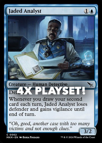 Magic the Gathering card, four copies of Jaded Analyst Nonfoil in Near Mint condition. Common from murders at karlov manor (MKM-62). A great addition to any collection or deck! Securely shipped in protective packaging. STOCK PHOTO USED.