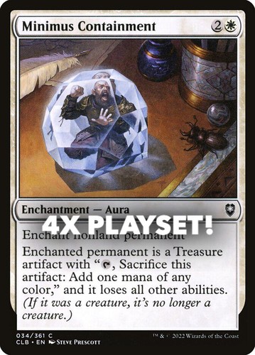 Magic the Gathering card, four copies of Minimus Containment Nonfoil in Near Mint condition. Common from commander legends: battle for baldur’s gate (CLB-34). A great addition to any collection or deck! Securely shipped in protective packaging. STOCK PHOTO USED.