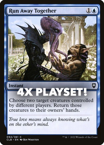Magic the Gathering card, four copies of Run Away Together Nonfoil in Near Mint condition. Common from commander legends: battle for baldur’s gate (CLB-92). A great addition to any collection or deck! Securely shipped in protective packaging. STOCK PHOTO USED.