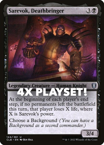 Magic the Gathering card, four copies of Sarevok, Deathbringer Nonfoil in Near Mint condition. Uncommon from commander legends: battle for baldur’s gate (CLB-144). A great addition to any collection or deck! Securely shipped in protective packaging. STOCK PHOTO USED.