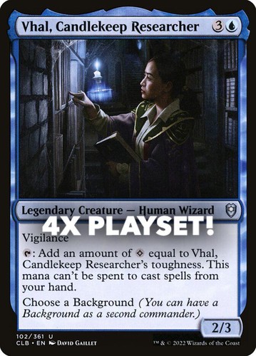 Magic the Gathering card, four copies of Vhal, Candlekeep Researcher Nonfoil in Near Mint condition. Uncommon from commander legends: battle for baldur’s gate (CLB-102). A great addition to any collection or deck! Securely shipped in protective packaging. STOCK PHOTO USED.