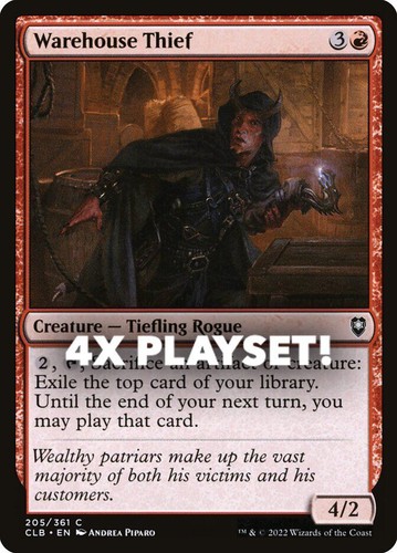 Magic the Gathering card, four copies of Warehouse Thief Nonfoil in Near Mint condition. Common from commander legends: battle for baldur’s gate (CLB-205). A great addition to any collection or deck! Securely shipped in protective packaging. STOCK PHOTO USED.