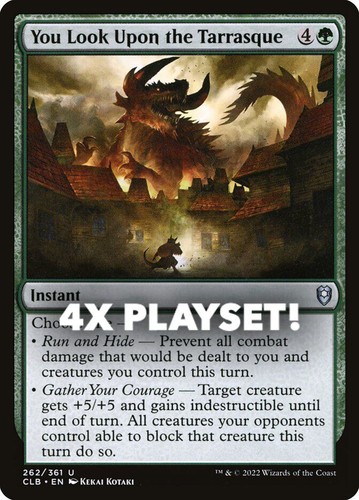 Magic the Gathering card, four copies of You Look Upon the Tarrasque Nonfoil in Near Mint condition. Uncommon from commander legends: battle for baldur’s gate (CLB-262). A great addition to any collection or deck! Securely shipped in protective packaging. STOCK PHOTO USED.