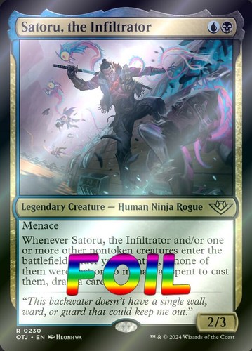 Magic the Gathering card Satoru, the Infiltrator Foil in Near Mint condition. Rare from outlaws of thunder junction (OTJ-230). A great addition to any collection or deck! Securely shipped in protective packaging. STOCK PHOTO USED.