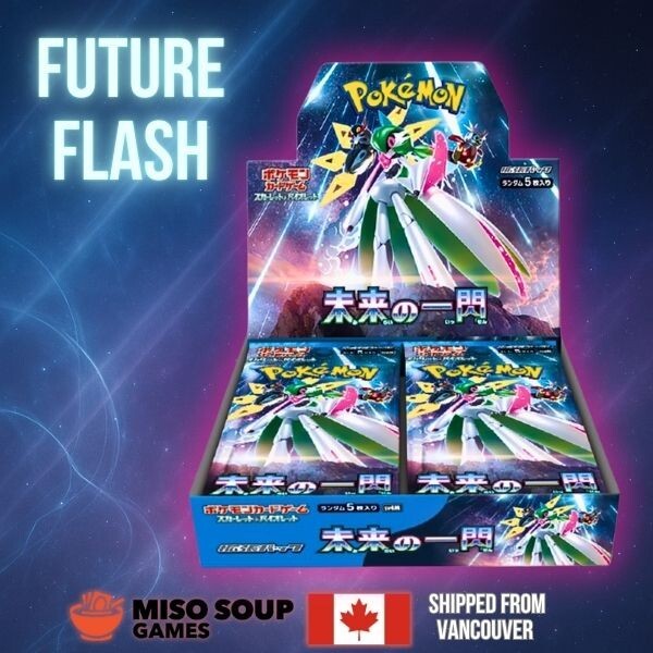 Prepare for the future of collecting with the Future Flash Booster Box — a brand-new, factory-sealed Japanese product packed with excitement. Featuring 30 booster packs with 5 random cards each (150 cards total), this set offers a fresh selection of cards, including powerful ex Pokémon, breathtaking full-art trainers, and exclusive holofoils. Imported directly from Japan and shipped from the west coast of Canada, this set highlights cutting-edge, futuristic Pokémon and their incredible abilities. Chase cards like Altaria ex, Iron Valiant ex, and Iron Hands ex are sure to excite both competitive players and collectors alike.